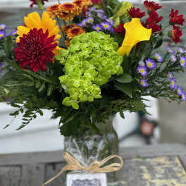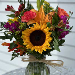 Price: $115.00 Chrysanthemums, gerberas, lilies and sunflowers in fall basket Product Tags: Next-day Delivery