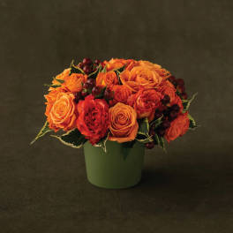 Price: $79.99 Two candle centerpiece with Orange roses, Orange Gerberas, Orange Lilies, and Mums Product Tags: Next-day Delivery