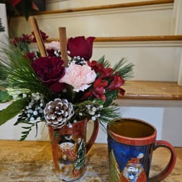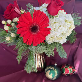 Price: $100.00 Red roses, red carnations ribbons, pinecones, candles and bows centerpiece Product Tags: Next-day Delivery